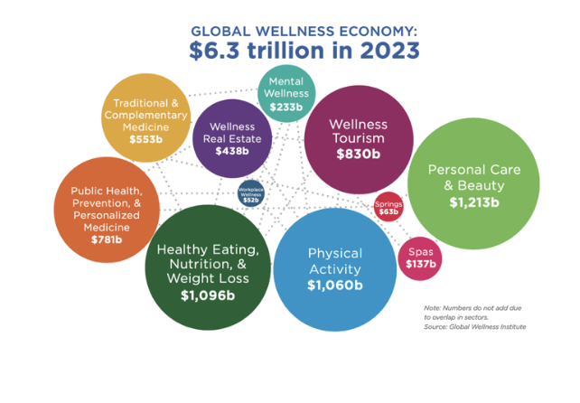 La industria del bienestar alcanzó los $6.3 trillones de dólares en 2023, representando el 6% del PIB mundial (fuente).